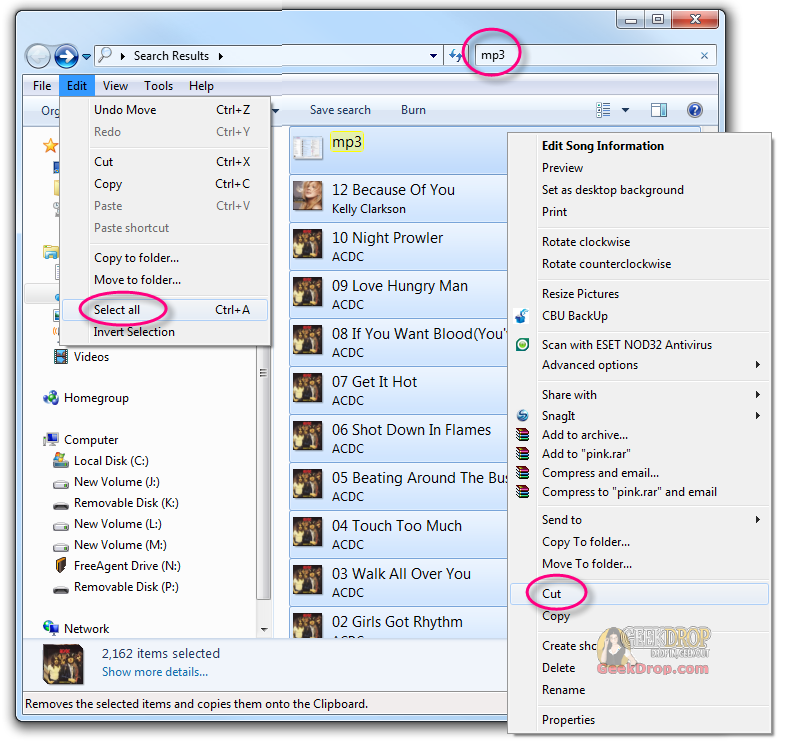 Why can't you do a search of all the MP3's then hit edit > select all > Cut > paste where ever you want.