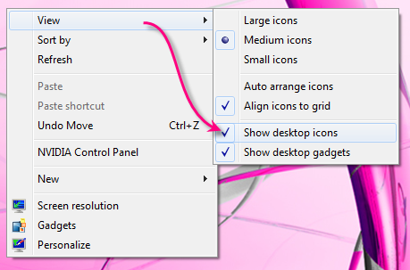 Vista/Windows 7: (as in the pic above) right click on the desk top > View > Uncheck "show desktop icons"