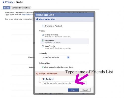 5.Then under "Except these People" you can either type in people's individual names or enter the name of a Friends List/multiple Friends Lists you created. Then click "Okay." Repeat for each section of your Facebook page you would like to edit Security Settings for. (By the way, make sure "Only Friends" under these sections is checked if you don't want everyone who is searching for you seeing everything on your profile)