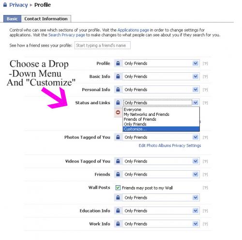 4. There are different sections that you can control what people can see (Status & Links, Profile (Wall), Info, etc). Select the Drop-Down menu for the section you would like a list/lists of friends to not see. Click "Customize"