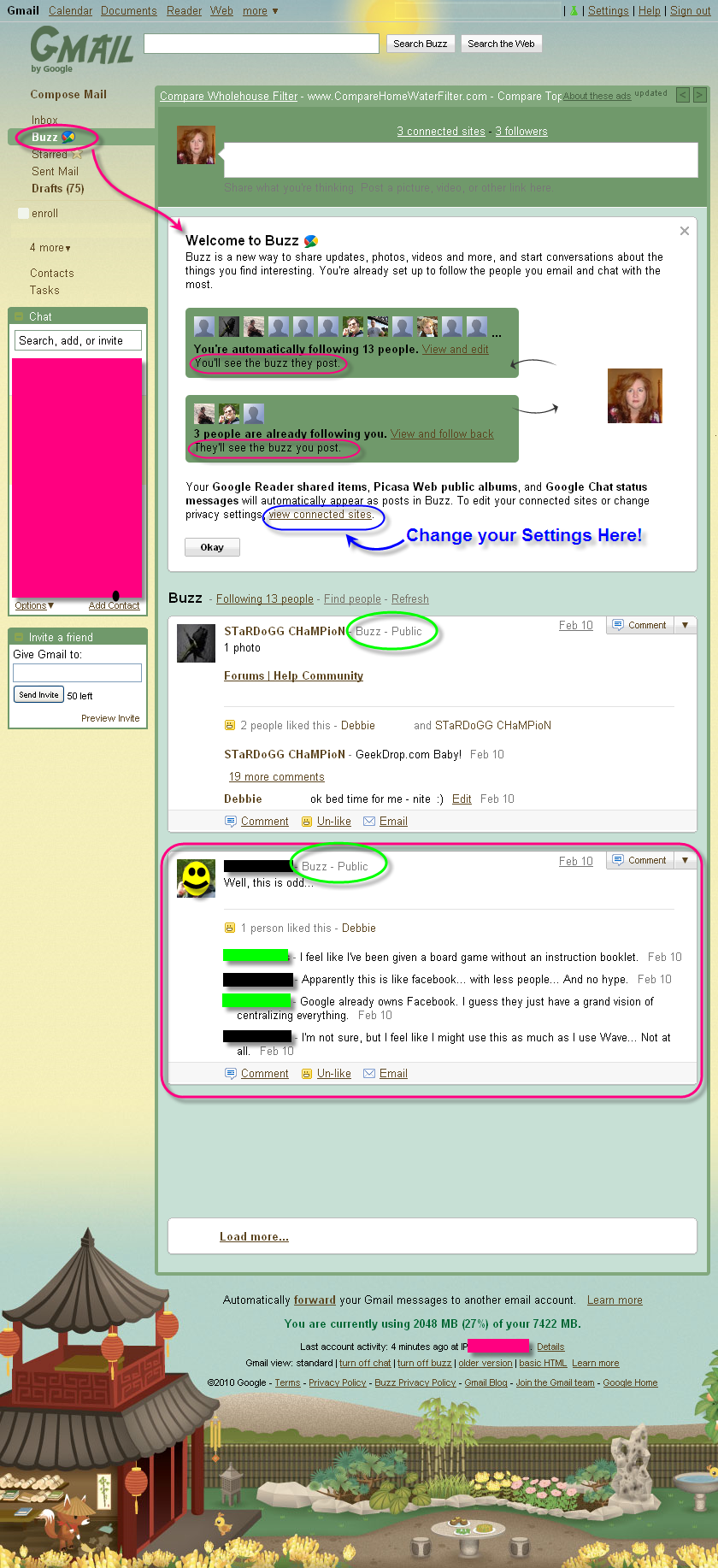 Here is my view last night logging on - note the chat at the bottom (circled in pink). I'm friends with the one blocked out in black but no clue who the green guy is and he started the chat. Notice next to it the "buzz - public" that means just that its PUBLIC!