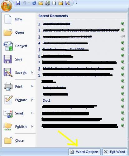 This is easy enough. First, hit the office button at the top left hand corner, you will see "Word Options" in the bottom right hand corner.