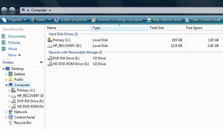 If you look my hard drive "D" is a "HP_Recovery" that is where my recovery is located. Now I have no idea which brand computer you have or what OS you have but I know that HP and Dell both use partitioned hard drives. To see if you have that simply to to Start > Programs> Computer