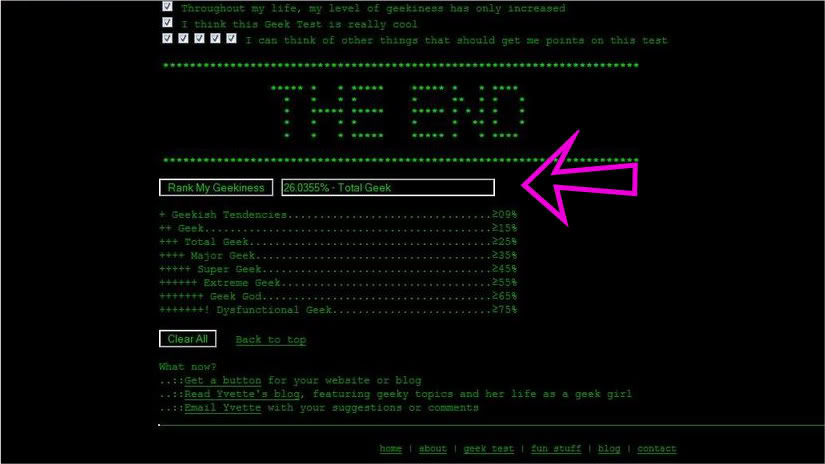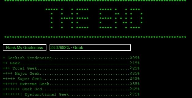 OK I took it and scored 43.395% Major Geek (I'm thinking I could have done better if I counted "naughty schoolgirl" in the dress up questions). Click the pic to see it larger: