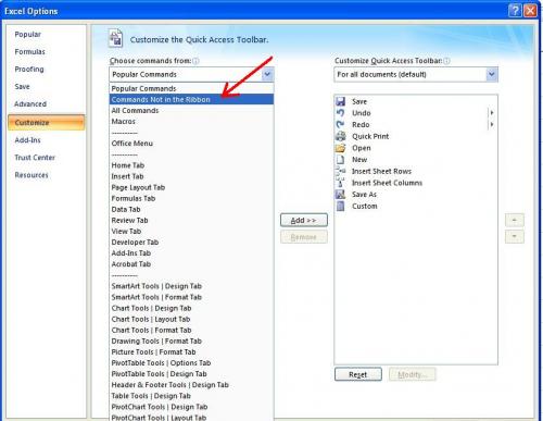 On the next Excel Options screen choose "Commands Not in the Ribbon" from the "Choose Commands From" drop down menu.