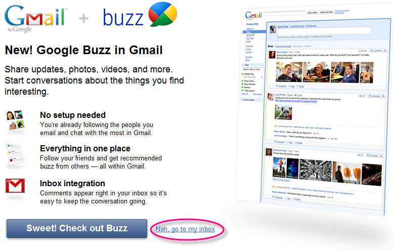I clicked the "Nah go to my inbox" and what do I see but google buzz on the side there for me to click like I already said I wanted it and I did not. Now google did take me to my inbox but it auto put the buzz there. So I look and this is what I saw (after I clicked on buzz)