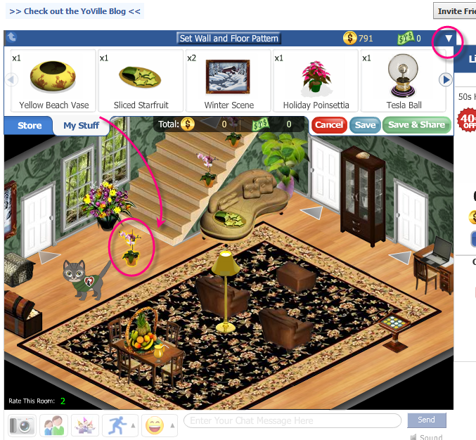 In this picture I want to place the flower pot on the stairs up high. So I drug the flowers down and stuck them on the floor. On the top right of the inventory bar you will see a Triangle (next to the dollars that you have). Click on the triangle: