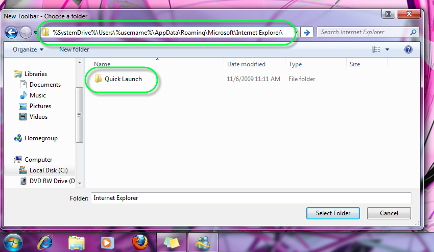 Highlight "Quick Launch" folder and then hit the "select folder" button.