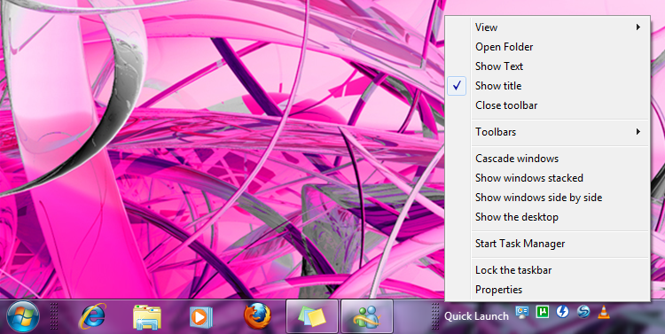 is awesome but its fun to tweek it. Needless to say I needed my Quick Launch on it. Well Quick Launch is still on Windows you just have to know how to get it. Here is a normal Windows 7