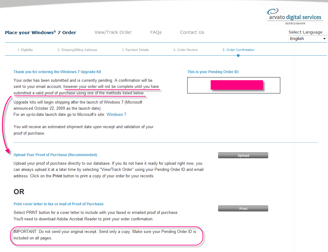 Once you review it they you will be given a Order number. This is where you will need your reciept. HP gives you one of two options - you can fax a copy of it in or scan and email the information. I scanned my receipts and attached them to the registration to submit.