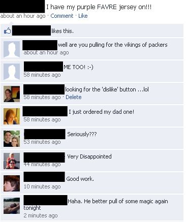 But I've always been a Favre fan, its kinda hard to be a football fan and not like Favre. But he lost a lot of respect with his on again/off again maybe-I'll-retire-oh-wait-I-won't stuff... I have a lot of Green Bay fans in my family too.
