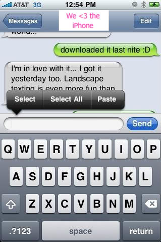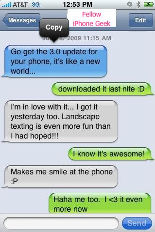 Yes folks, copy and paste is finally here! You can at last copy text and paste it elsewhere. This feature was sorely missing from the iPhone and we have been anxiously waiting for it. If lets say you want to copy a link someone texted you to paste elsewhere, double tap on the screen and copy away! Ah let the good times roll.