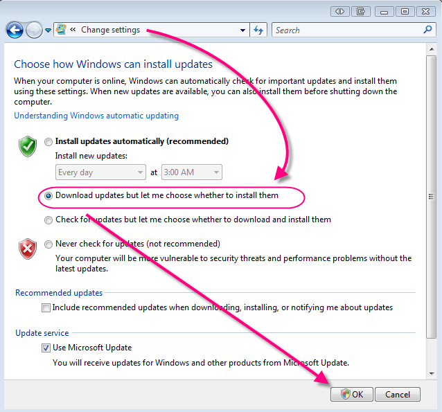 Now you can change your settings. This is where you want to change them. Under Recommended updates, select the "Include recommended updates when downloading, installing, or notifying me about updates" check box, and then click OK