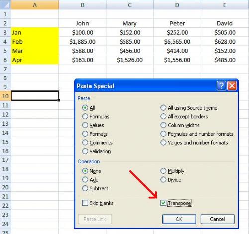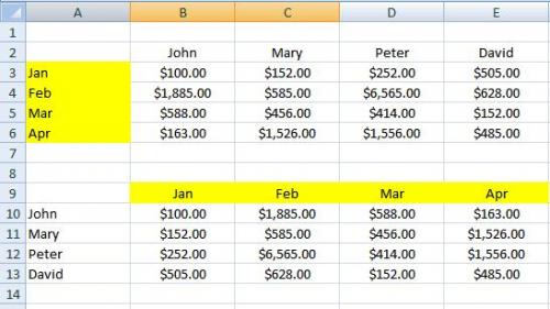 Here's a little tip that will eliminate the need to retype data. For example, say you enter data into a spreadsheet with 4 column headings across a row and 4 row headings down a column as follows: