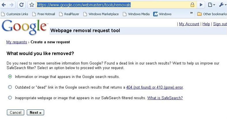 PS- You must have a Gmail/Google account in order to use the Webpage removal request tool. If you don't already have a GMailaccount, set one up! It's free. I Gmail.