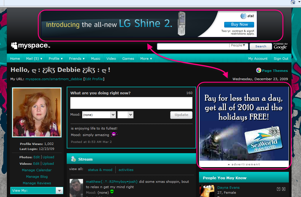 Another nice thing about Firefox is that you can really customize it to your liking. There are all types of add ons. One of my favorite addons is called Adblock. Here is two screen shots of my myspace home page (since your familiar with myspace) - one in internet explorer and one in Firefox: