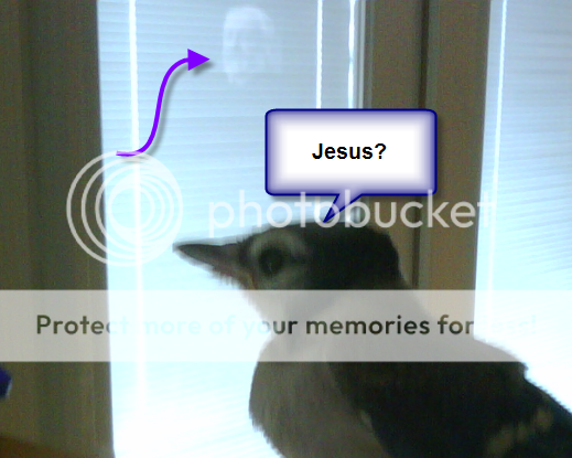 SO I thought ok let me take a pic of the bird to show you all. So on my trusty blackberry I took a pic with my hubby holding it on his finger. In the background I have french doors that lead out to my pool. The doors are double pained and have verticals between the glass. Ok look at the window and I swear on a stack of bibles that is NOT photoshoped in. Tell me that does not look like Jesus in the window