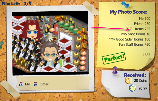 OK here is a tip when you are building a house find a room or a hall or a closet and make it a storage dumping room. Once you have this room use it as a area to take your pictures. Every five hours you get film, five rolls which generally if your first picture is "perfect" you get a bonus roll. See the more items you have in your photo the more points and more coins you get. The most you can get is 20 coins and 20 yo points. So if you get the bonus roll of film you can possibly make 120 coins and 120 yo points. See here is a perfect score and as you can tell its in a junk/storage room (71 items in the picture):