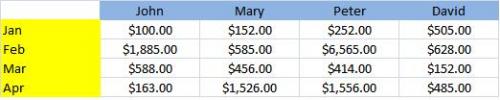 Here's a little tip that will eliminate the need to retype data. For example, say you enter data into a spreadsheet with 4 column headings across a row and 4 row headings down a column as follows: