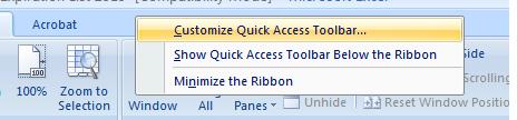 First, right click on the toolbar and choose "Customize Quick Access Toolbar".