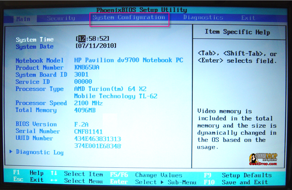 That is what "Bios" looks like upon starting up in it. Now at the very top you will see you are in the "Main" tab. With the use of your arrows and go to the "Systems Configuration" (squared in hot pink in the photos)